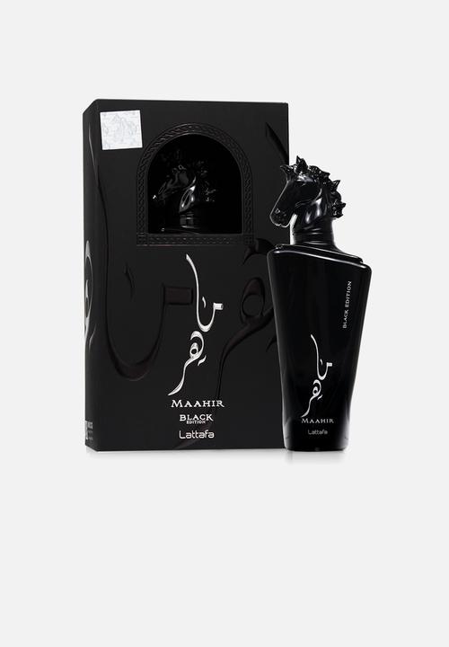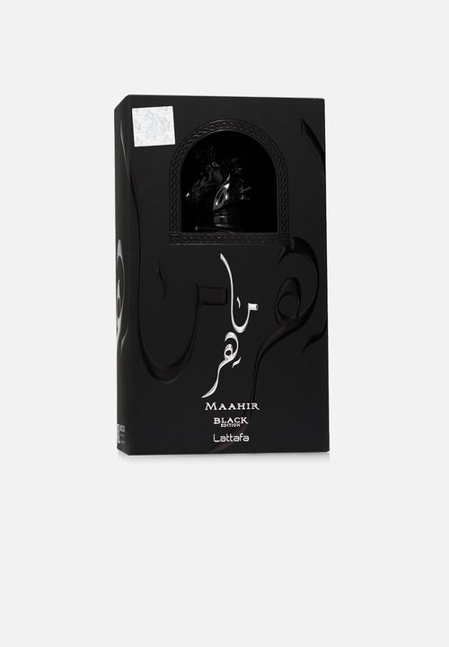 Maahir Black Edition by Lattafa Perfumes is a Woody fragrance for men. Maahir Black Edition was launched in 2019. Top notes are Black Pepper, Pink Pepper and Saffron; middle notes are Labdanum, Cade oil, Gurjan balsam and Rhubarb; base notes are Leather, Cedar, Patchouli, Guaiac Wood, Musk and Moss.